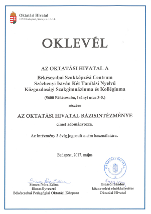 Iskolánk 2017 januárjában adott be pályázatot Az Oktatási Hivatal Bázisintézménye cím elnyerésére. Az Oktatási Hivatal által kiírt pályázaton – a Pedagógiai Oktatási Központ és a bíráló bizottság javaslatai alapján – az Oktatási Hivatal köznevelési elnökhelyettese a rendkívül magas szakmai színvonalú pályamunkák közül a Békéscsabai SZC Széchenyi István Két Tanítási Nyelvű Közgazdasági Szakgimnáziuma és Kollégiumát érdemesnek ítélte Az Oktatási Hivatal Bázisintézménye cím viselésére.